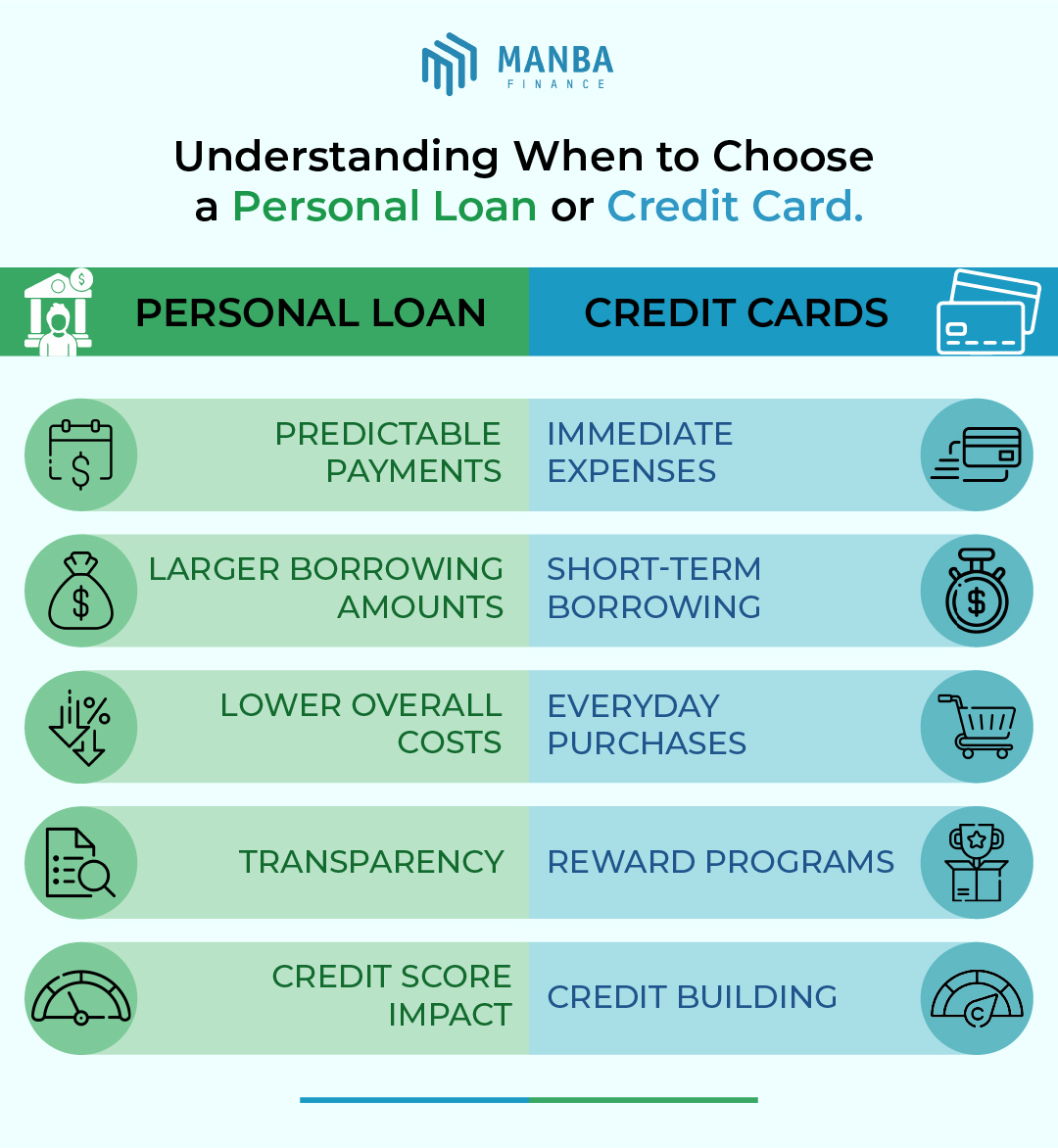 When should I choose a personal loan over a credit card? For anything you can't repay in 1-2 months. Can I use a credit card instead of a personal loan? Yes, for short-term needs.
