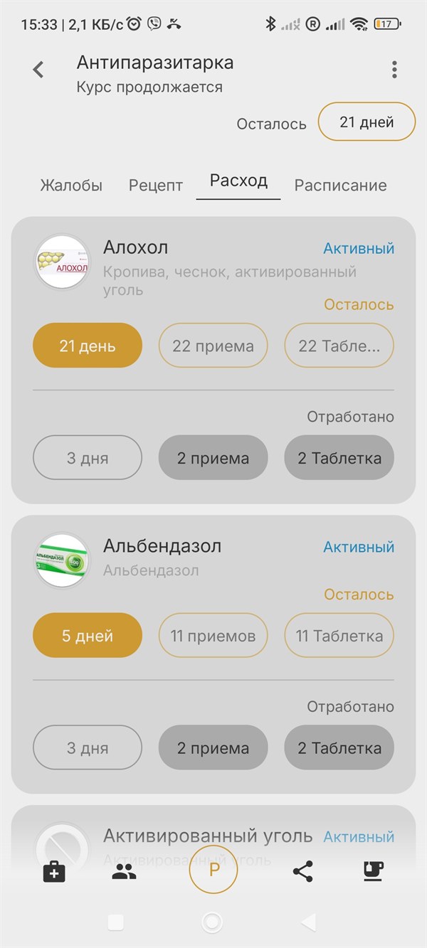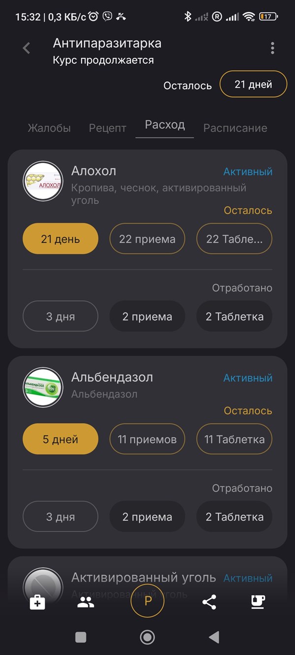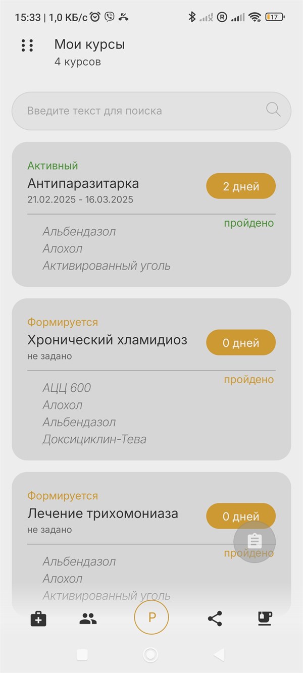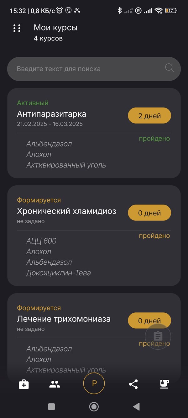 Курс лечения — приложение помогает не только фиксировать прием лекарств, но и следить за их окончанием, напоминая о необходимости продления или завершения.
